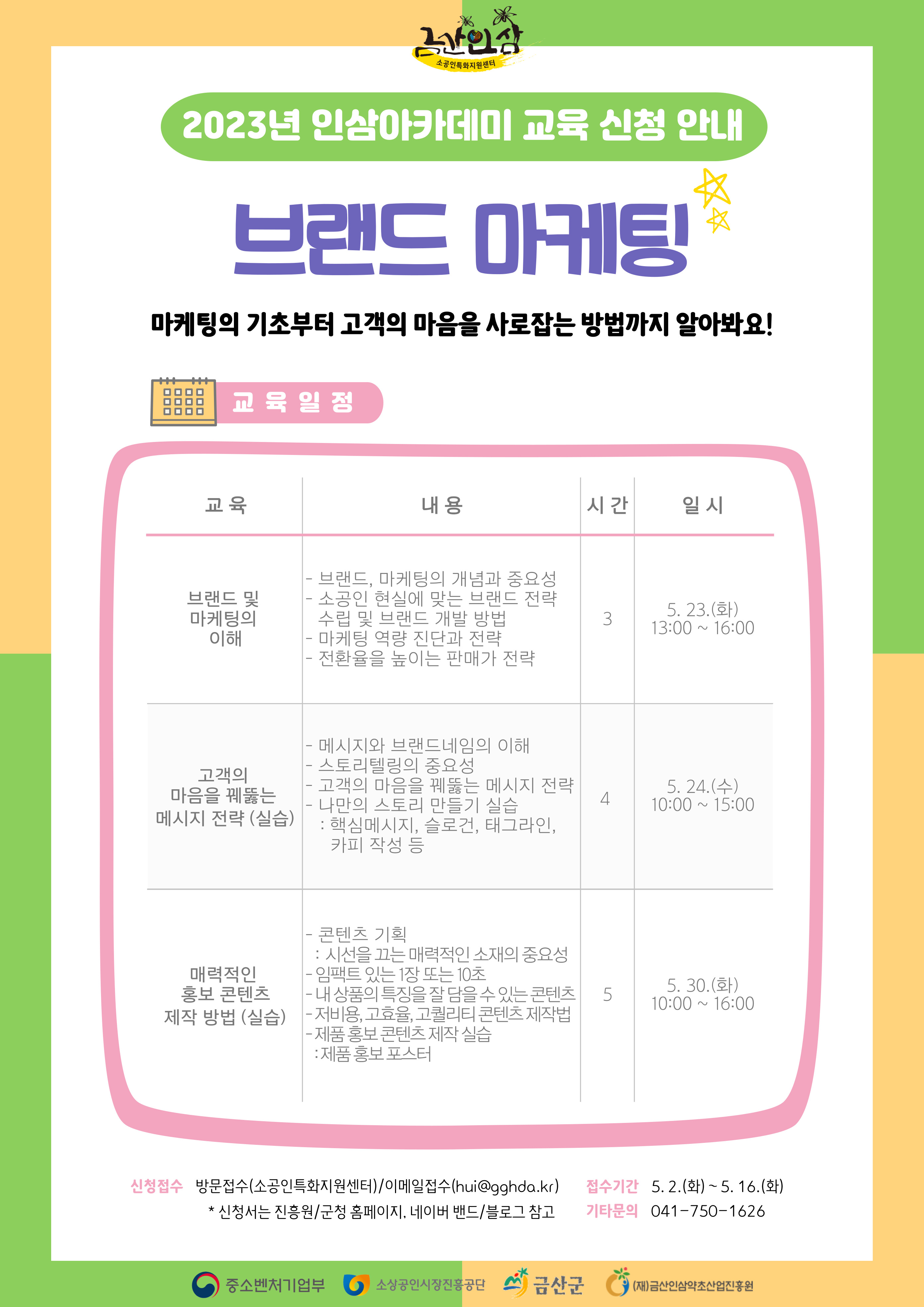 금산인삼 소공인의 역량 향상을 위한 <인삼 아카데미-브랜드 마케팅>교육생을 모집합니다. 자세한 내용은 아래 모집 공고문과 첨부파일을 참고하시어 많은 신청 바랍니다.