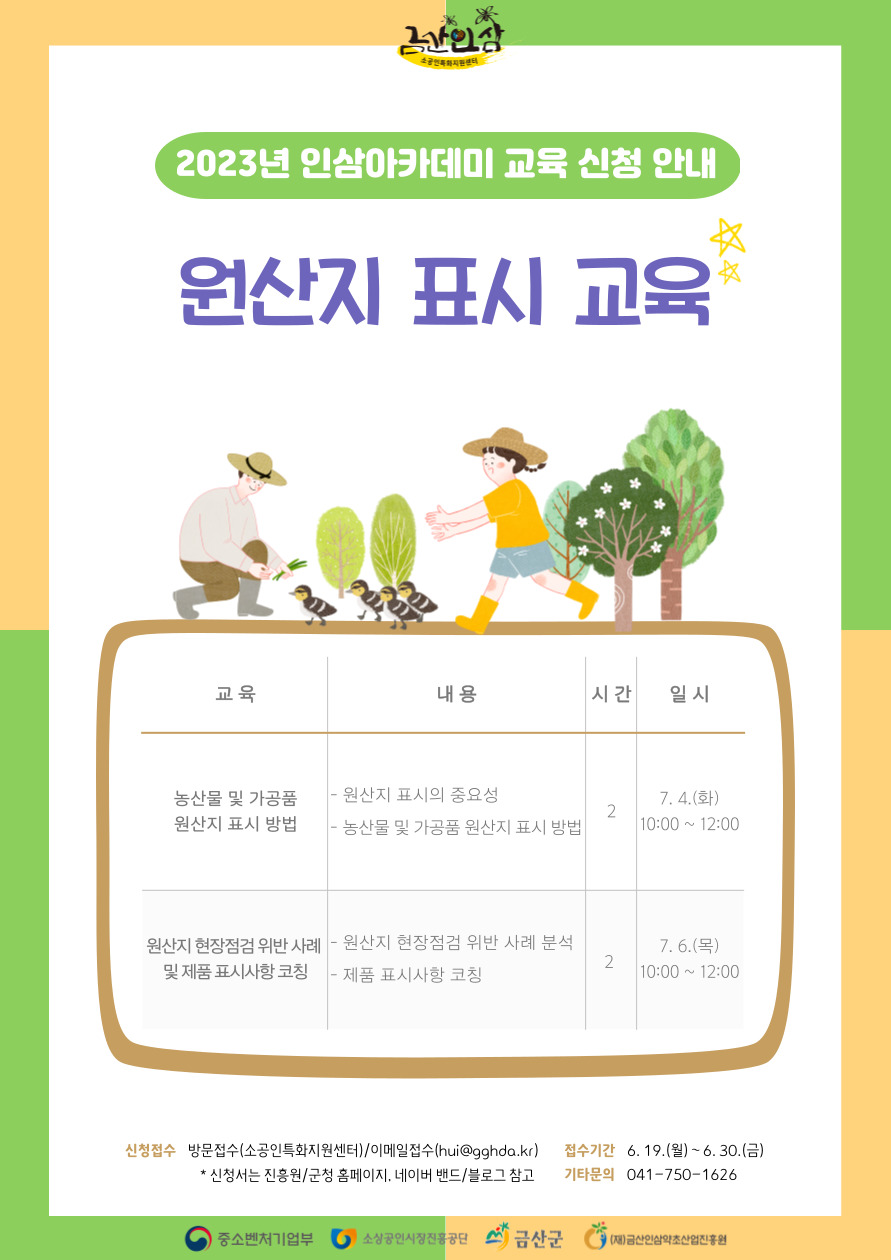금산인삼 소공인의 역량 향상을 위한 <인삼 아카데미-원산지 표시교육>수강생을 모집합니다. 자세한 내용은 아래 모집 공고문과 첨부파일을 참고하시어 많은 신청 바랍니다.